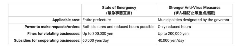 Here are some of the differences between the “State of Emergency” and “Stronger Anti-Virus Measures” are listed in a table attached as an image