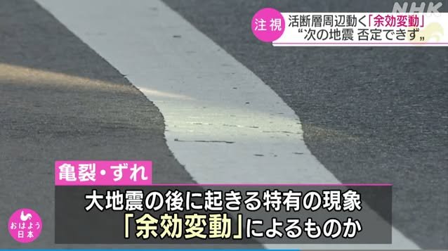 Here’s something I saw on TV about the phenomenon of “postseismic deformation” (余効変動). The first picture shows how a straight line that was painted on a repaved road after the quake has been twisted by postseismic deformation in the last few years. I took it from a video that can be seen on the following page: