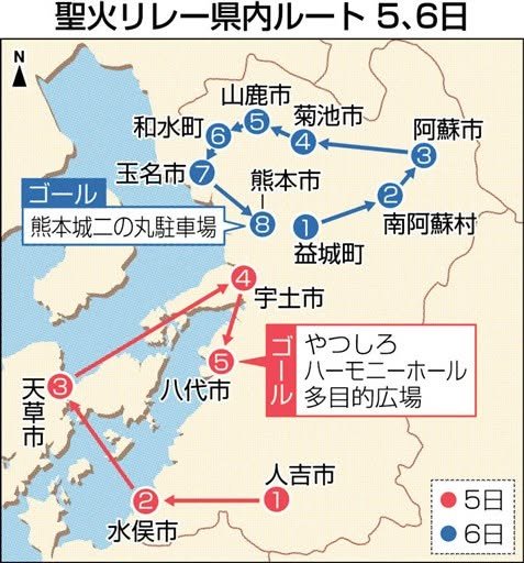 The Olympic torch is called in Japanese 聖火 (seika, or holy flame), overdoing it a bit in my opinion. It will pass through Kumamoto on the 5th and 6th. The rough route can be seen at the map below, and a list of times at the link. It will end up at Ninomaru on the 6th at roughly 8:30 PM. - William