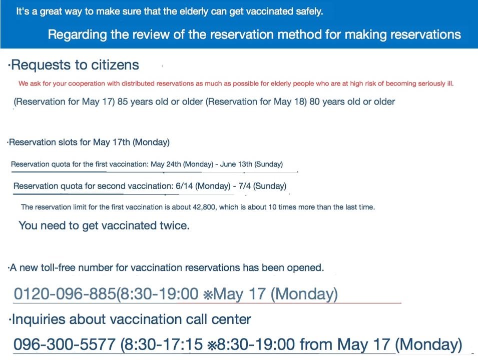 Here are two recent translated posts from the Kumamoto City Government regarding an infection at Kumamoto City Hall and an advisory for those planning on making vaccination reservations for the next tranche on May 17: