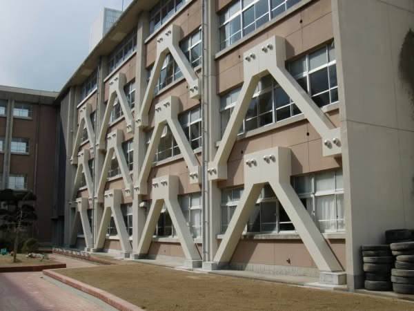 One will often see these inverted V-shaped things on buildings, particularly schools, in Kumamoto. This is called “seismic retrofit” (耐震工事, たいしんこうじ) and is intended to reduce the horizontal stress that a building undergoes during an earthquake. (Presumably, newer buildings incorporate them.) But this story about a building in China that suddenly started shaking even with no seismic activity is startling. Architectural integrity is paramount. - William