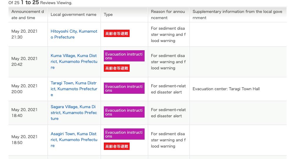 To get a better idea about what you need to do in your particular location, you may want to click on your community name and read the fine print. For example, I live in Kumamoto City and my part of town is in red (高齢者等避難; the elderly and others with special needs should evacuate). However, if you click on the link and read the explanation you’ll find that it only applies to people who live close to a steep incline or cliff, etc. In other words, even if you are in the designated category of people, you might not be in a place where you were actually advised to evacuate. On the other hand, some areas are asking everyone to evacuate.