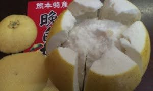 Kumamoto is famous for citrus(kankitsurui-柑橘類). Asia is where citrus originated, after all. There are so many types of citrus in Kumamoto that even the locals don’t know what they are. The woman whose desk is next to mine gave me some citrus this morning. I asked her what it was, and she said, “Dunno. Some kind of citrus.” Kumamoto is very famous for the banpeiyu (晩白柚) - when you buy it, it looks like a bowling ball, but once you’ve peeled it, it’s more like a softball. - William