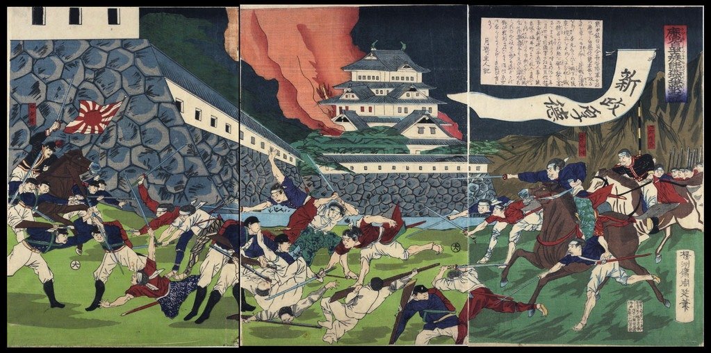 One builds a castle in the hope that its simple existence will act as a deterrent. Turns out this didn’t happen when the Satsuma forces determined to march on Edo, which took them through Kumamoto, controlled at the time by the Edo government. Events got, shall we say, out of hand as the Satsuma forces fired on the castle from a nearby hill. The event is famously portrayed in the movie, The Last Samurai. Attached is an ukiyoe of the battle, which resulted in the destruction of the original structure. -