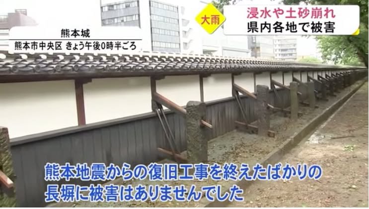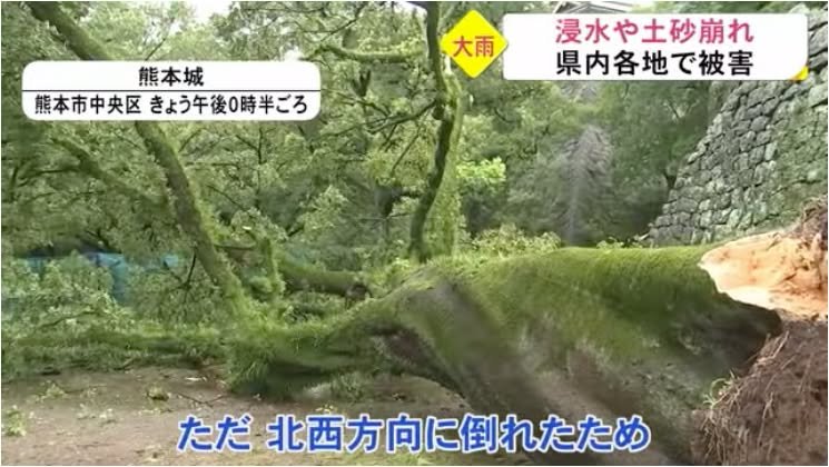 Kirk with another update on the rain. The images are from the following TKU video (click on the click to view the Japanese video; it includes reports on several different kinds of damage). I heard on RKK that the rain loosened the earth that the roots were clinging to and that that led to the tree’s collapse. If the tree had fallen in a slightly different direction, it would have damage the walls shown in the second picture. Those walls were severely damaged in the 2016 earthquake and repairs on them had just ended.