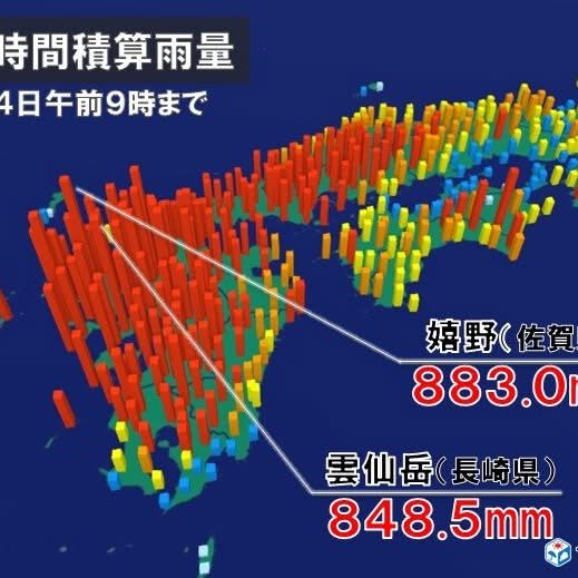 Kirk here with a graph showing the amounts of rain that have fallen in the past three days as of 9 AM this morning. Kumamoto hasn’t had the largest amounts – Saga and Nagasaki have had more – but records have been set all over. The numbers are in millimeters, so spots that have gotten the most rain would have close to a meter of water on the ground if none of it had drained away. There’s a lot more to report but I’ll stop here for now.