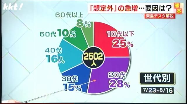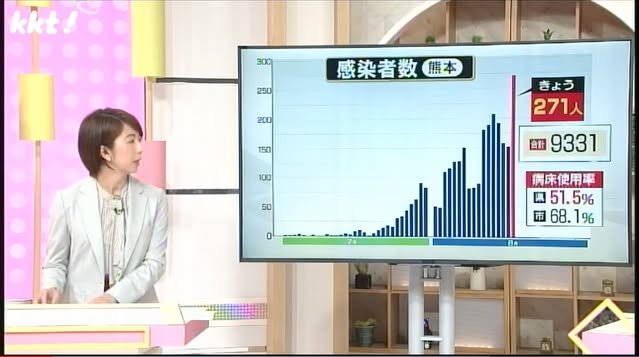 Kirk again. In response to my post about the record high number of positives recorded today, Megan raised the issue of hospital beds. This is an important point that was mentioned in what I saw on RKK but that I forgot to mention in my post. I looked on the web and found a KKT report that’s relevant. I’ve attached the URL and the images are from that report. First, the bar chart shows how the numbers have increased recently. Last week, the vice-governor who usually does the press conferences (sorry, I forgot his name) said that they were prepared to deal with numbers of up to 250. So, 271 “exceeds expectations” – the term 想定外 (souteigai; outside of the expected range) in the next image. The “51.5%” you see on the first imaged refers to the percentage of hospital beds reserved for COVID-19 cases that are already occupied. This number is for the prefecture as a whole and 68.1% is for Kumamoto City (where more than half of the cases are occurring).