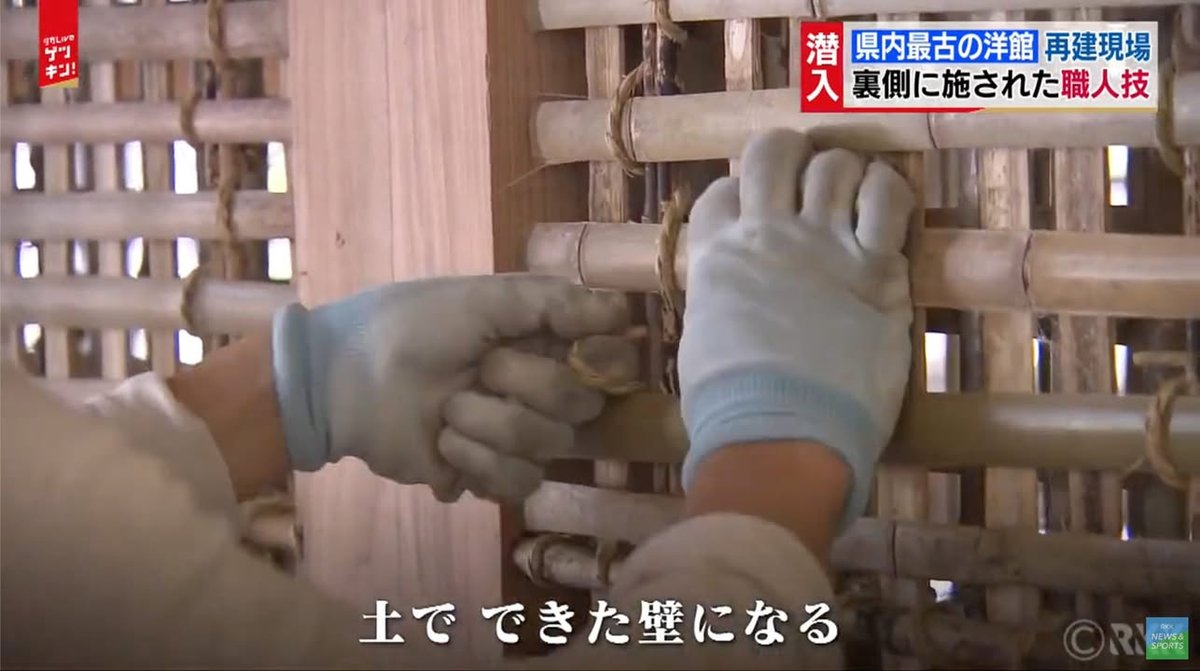 The home is being built the old-fashioned way – by hand. The walls will be mud that is spread over a bamboo scaffolding (see photo). This kind of work is very labor intensive, which makes the process of rebuilding expensive. The price tag is about 500,000,000 yen (almost 5 million US dollars).