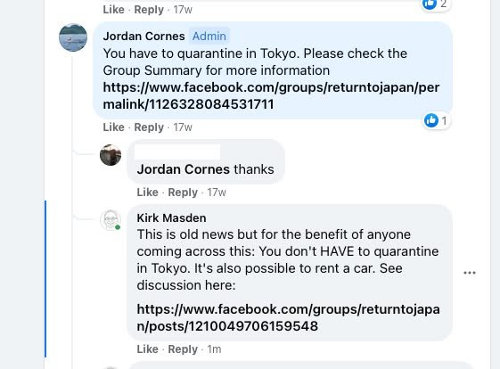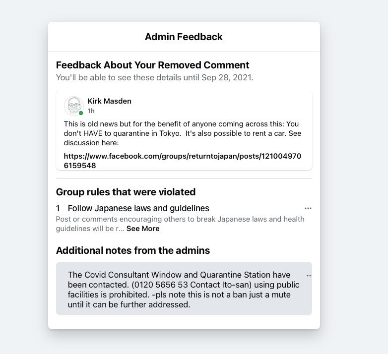 Please look at the first image. Here the administrator says that you have to (which I take to mean “must”) quarantine in Tokyo. This was in response to an inquiry about whether or not you can take a connecting flight to another region of Japan. While it’s true that you can’t take a connecting flight, staying in Tokyo (that is, renting from companies like MetroResidences) is not the only option. As you can see in the second image, other people had already pointed out that it’s possible to rent a car. But, when I said the exact same thing, but in a comment to the administrator and with a link to previous discussion, I was disciplined (third image).