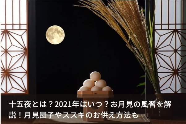 【お月見について】 十五夜は秋の美しい月を観賞しながら、秋の収穫に感謝をする行事です。この時の月を「中秋の名月」と呼び、一年で最も美しい月だと言われています。お月見には「ススキ」、「お団子」、「農作物」を供える習慣があります。 ススキ・・・稲に見立てて、豊作を祈念します。また、切り口が鋭いので魔除けになると言われています。 お団子・・・丸い形が満月を表します。 農産物・・・里芋や栗、枝前といった収穫したばかりの農産物をお供えして収穫に感謝します。 お供えしたお団子や農産物はお月見の後に食べることによって健康と幸福を取り入れると言われます。 お月見は他のアジアの国でもあります。中国では「月餅」を、韓国では「松餅」を食べます。