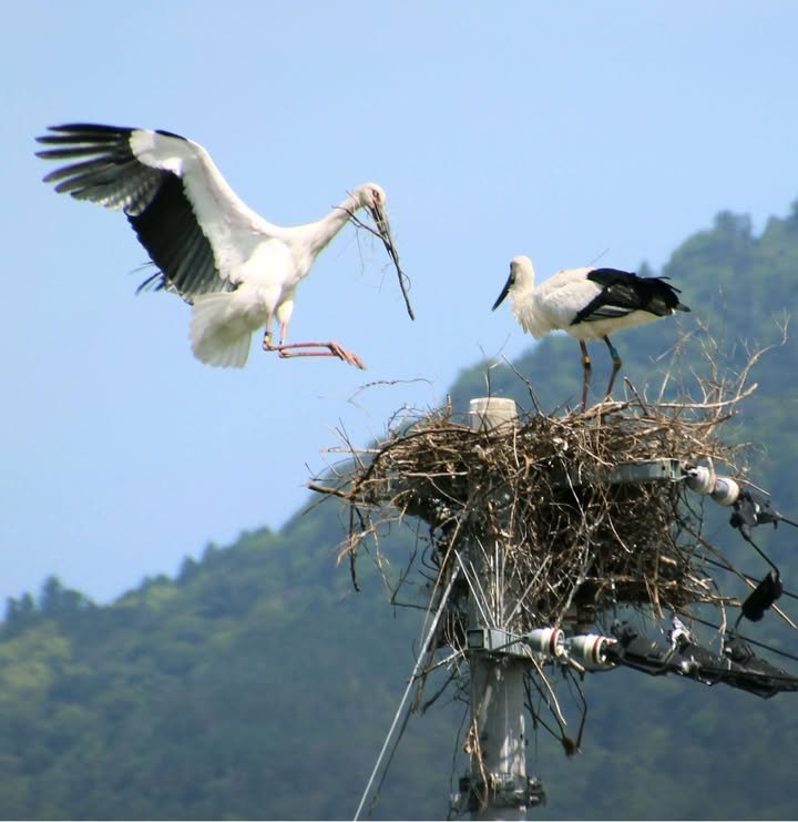 William. Another post about birds: The Oriental Stork has appeared within city limits. (Logophiles, take note: from German Storch (ster-) , meaning “stiff.” Perhaps so called with reference to the bird’s stiff or rigid posture.) To understand why this is exciting, a bit of background is required. The stork was once extirpated from Japan and the Korean Peninsula. However, in May 2007, a hatchling was reported in Japan for the first time in 40 years, down in the marshes of Yatsushiro, where the farmers scatter seed to attract them: their diet includes many rice paddy pests. A housewife in Hagiwaramachi spotted one checking out a utility pole, likely as a place to build a nest. That is all for the good news today. (The photo is stock as an example of how the storks build nests above utility poles.)