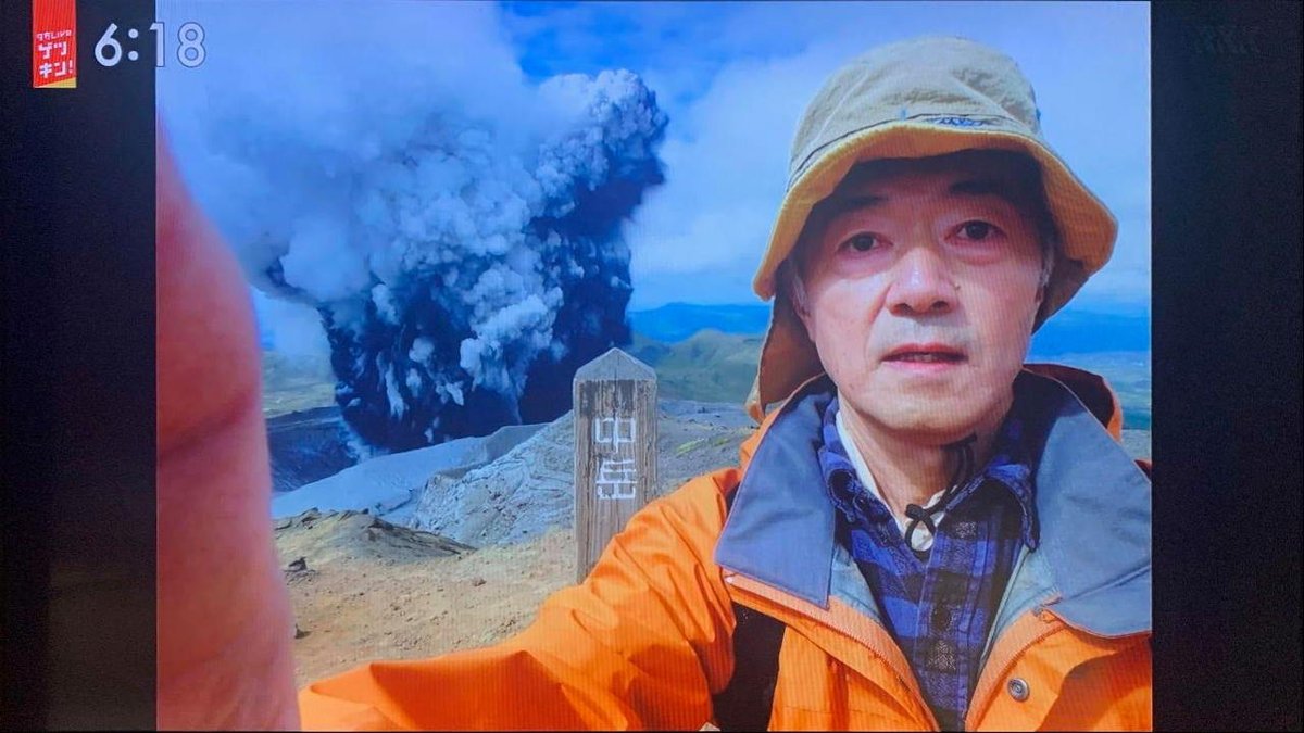 Kirk here with a picture I took of my TV screen (RKK). This man said that, after reaching the summit of Nakadake, he turned his back to the volcano, held up his camera to take a selfie and then noticed the eruption. Then, hearing rocks falling, he ran for cover and found a concrete shelter made for such occasions.