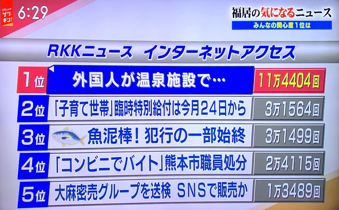 For the past few days, RKK has been reporting on the arrest of a non-Japanese resident of Kumamoto on suspicion of inappropriate sexual behavior at a local onsen. Until today, I decided against posting about it because I couldn’t see much value in doing so. Today, however, RKK reported that their video about the arrest has gotten far more traffic on the web than other news items. One reason may be the salacious nature of the news itself. I’m afraid, though, that another reason may be that anti-foreign denizens of the internet have taken an interest is spreading the news as confirmation of their xenophobic stance. So, in that sense, I felt that non-Japanese residents of Kumamoto should at least be aware that this sort of news is going around. According to the last report I heard, by the way, the accused person is denying the charges.