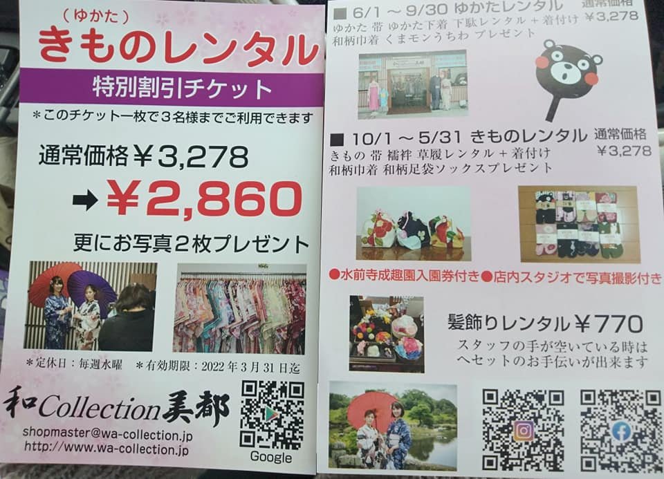 Happy New Year! Atsuko here. Did you go to the New Year’s visit? Some of you may want to wear a kimono. There is a kimono shop ‘‘和 collection 美都’’ in Suizenji Park where you can rent a kimono to wear. My daughter is going to have her coming-of-age ceremony, so we rented a kimono there and wore it. Some people who have worn yukata and kimono there, but it’s not so well known that you can also wear furisode and hakama there, many various Kimono not only Yukata. If you want to wear furisode or hakama, you need to make an appointment as it takes time. Kimono can be rented for a day, so you can visit Suizenji Park and then go to Kumamoto Castle for fun. I rented a kimono for two days and one night (extra charge) and enjoyed dinner in a kimono too. P.S. If you want to take a professional photographer to Suizenji Park, there is an extra charge (10000 yen) to enter the park.