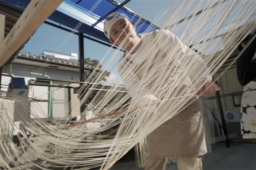 William. A product’s quality, reputation or other characteristics can be determined by where it comes from. Geographical indications are place names used to identify products originating in and sharing characteristics of their homeland (for example, “Champagne”, “Tequila” or “Roquefort”). One wonders why “somen” is not simply termed “Kumamoto.” Kumanichi reports on the winter tradition of “cold somen fabrication,” when extra-fine noodles hand-rolled by craftsmen and cut to a length of about 3.5 meters and an extra-fine thickness of about 0.1 to 0.5 mm are dried in the sun, shimmering like silk thread. Kumanichi has the details. Get ’em while they’re still sea-breeze tinted.