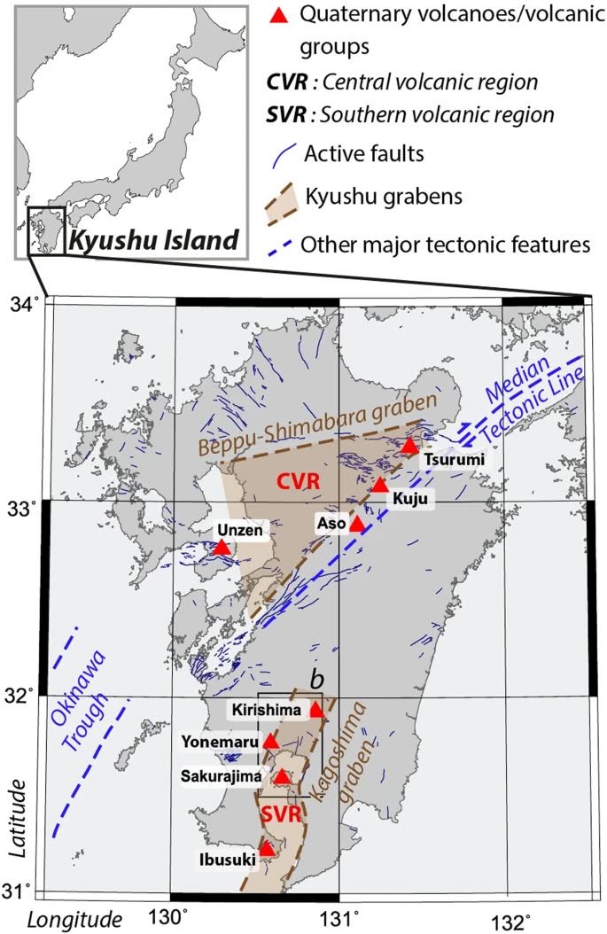 William. Looking into any relationship between volcanic activity in Kagoshima and Kumamoto resulted in “probably not” - and also a pretty illustration of Aso clearly showing the Tateno gap, created by the same fault that caused the seismic unpleasantness a few years ago, without which the caldera would be a lake. As the schematic shows, the Kagoshima and Beppu-Shimabara graben (a depressed block of land bordered by parallel faults) are distinct, though their relationship with volcanic activity is still unclear. If you have a free afternoon, websurfing this topic is rather interesting.