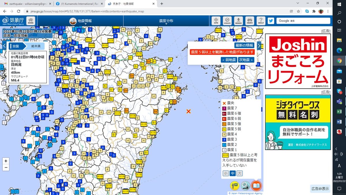 William That quake you felt had an epicenter on the eastern side of the island, just offshore of Oita Prefecture, and was a M6.4 (ours years back was a 6.2). I suspect they are having some trouble over there now, but at least it’s not raining. Stay alert nonetheless.