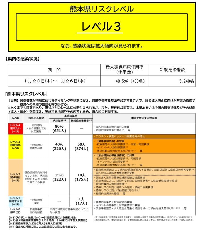 Kirk here reporting 1) that there were 1281 new infections identified today (another record) and 2) that the official risk level in Kumamoto Prefecture has been raised from 2 to 3 on the prefecture’s 5-point scale. The image you see is from the following page pn the prefecture’s website: