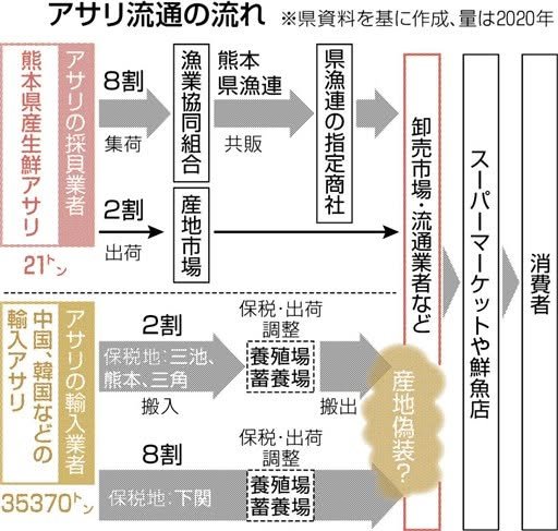 William How the Kumamoto Clamshell Scam unfolds is interesting to observe. As suspected, clams originating in other Asian countries are temporarily planted in Ariake sea and when harvested are then claimed to originate from that area. As a Californian, I can understand the dilemma. California makes excellent sparkling wine that cannot be termed “Champagne” is it is not from the Champagne region of France; thus, it is termed “sparkling wine” or “cava” though it is really the same thing (and saves you money!) So the question is: when is a clam from Ariake termed to be actually from Ariake, and how much is that distinguishment worth? (The graph regarding who flows what to whom reminds me of the meth flow from my home state - just a reminder that it could be quite worse.) https://kumanichi.com/articles/549507