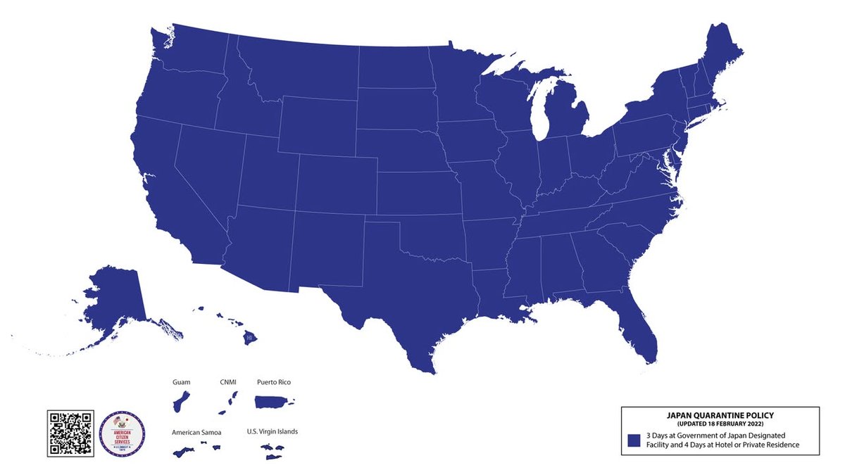 William A “travel alert” from the US Embassy just alighted (if you’re not registered, you should be - they’re mostly entertaining but occasionally important): “The Government of Japan announced that, as of February 18, the quarantine period for all travelers arriving in Japan from the United States has been reduced to seven days, the first three of which must be in a government-designated facility. Currently, Japan’s quarantine duration does not take travelers’ vaccination status into account.” The accompanying map is interesting. Many US troops are affected by this, and many now occupy territories seized from Spain in the Spanish-American war, a period of history one must read up on.