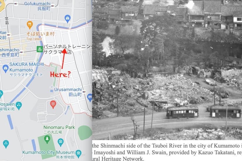 Kirk here with a folllow-up to William’s post about the bombing of Kumamoto in WWII. The photo in it piqued by interest so I tried to figure out where it was taken and from what angle. The Shinmachi place name, the curving tram line (which I assume followed the same route that is does today), and the Tsuboi River (visible beyond the curving tram tracks) made it relatively easy to make an educated guess.