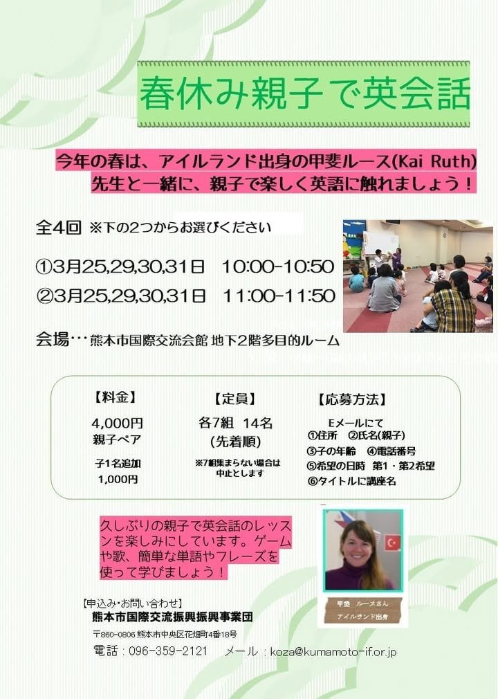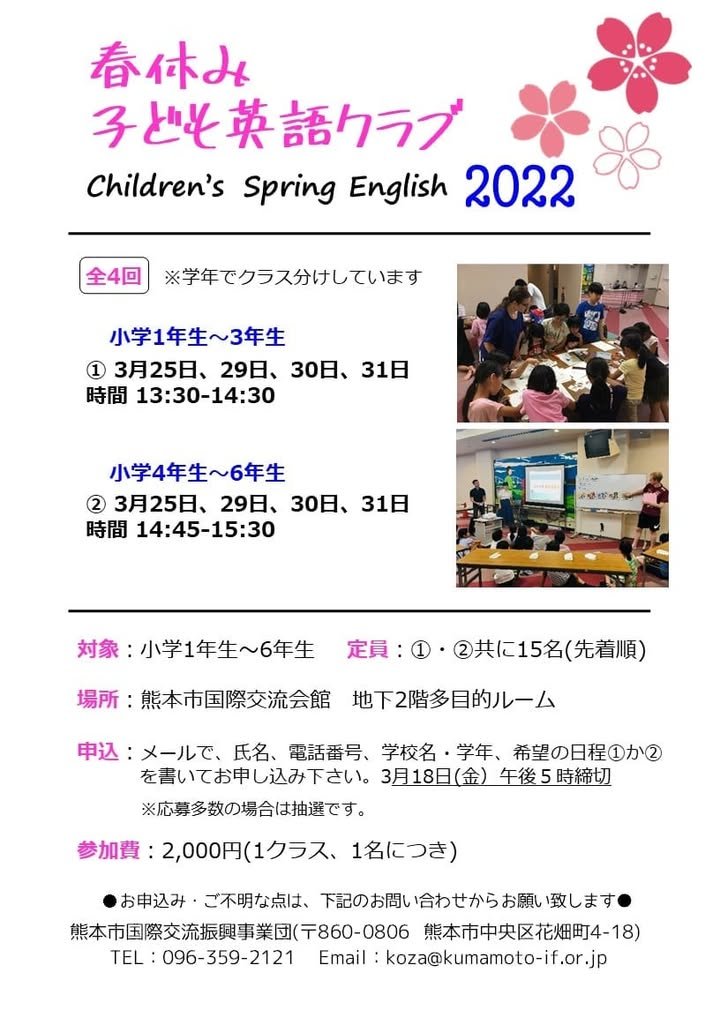 Kumamoto International Center’s 『Spring English』 for children (and parents of preschoolers) is planned to make a comeback at the end of this month. 熊本国際交流で、四日間の幼稚園児向け「春休み親子で英語」(午前中)と小学生向けの「春子ども英語クラブ」(午後中)は3月末に復活する予定です。