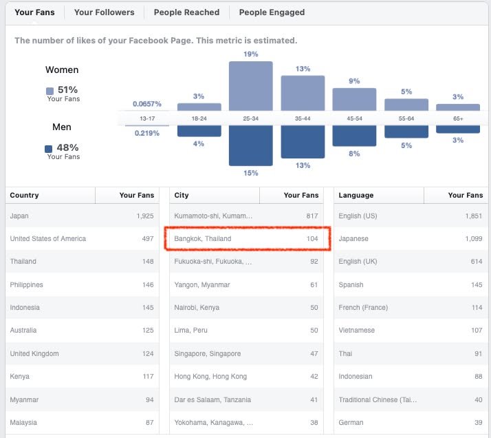 Kirk here with what I think is a sort of “fun fact” about this Facebook page: After Kumamoto City, the city with the most people who “like” it is . . . drum role . . . Bangkok, Thailand! Fukuoka is next followed by Yangon, Myanmar. Most of the other facts about who “likes” this page are not particularly surprising. We have a fairly even split between men and women, and, as an old guy, I’m in a distinct minority.