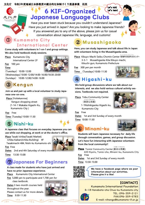 —- start quote —– 【The study of Japanese】 Kumamoto International Foundation has restarted Japanese learning. For more information, please access our website or inquire of the foundation. https://www.kumamoto-if.or.jp/list00066.html —- end quote —-