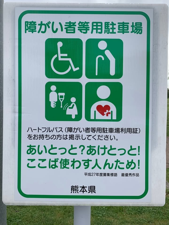 あいとっと? 空(あ)いているの? Is this parking spot open? あけとっと! 空(あ)けてあるよ! It has been left open (intentionally) – ここば使わす人んため! ここをお使いになる人のために! – for those who need it!