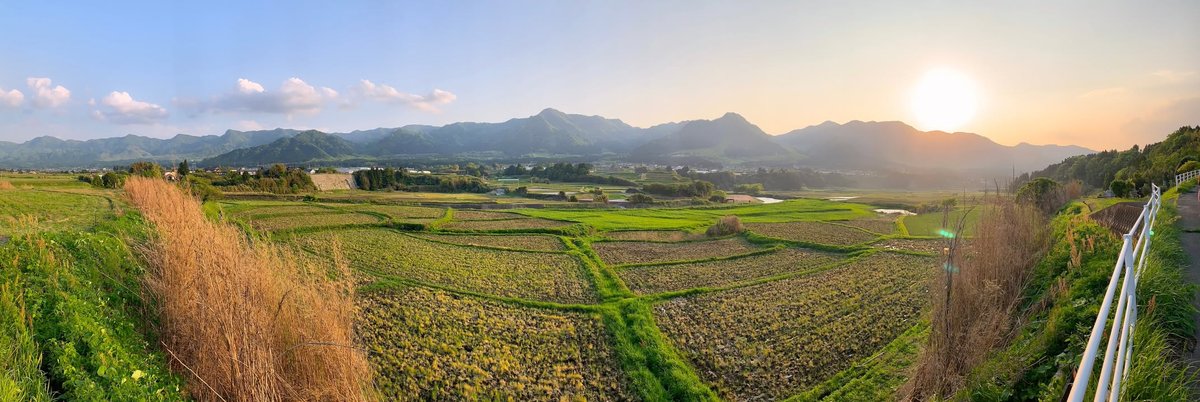 Kirk here with a photo I took in Aso today. My wife and I want late in the day so we didn’t have to deal with traffic. The late afternoon light made Aso look even more beautiful that usual. We got out of the car and walked for a while to enjoy the scenery you see in this photo. You can see just a hint of the Shirakawa winding its way through the fields.