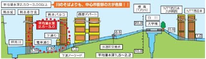 William With rainy season on our doorstep figuratively, let’s hope it doesn’t end up on our doorstep literally. The figure shows that the areas adjacent to the banks of Shirakawa are lower than the river and how flooding (kōzui、洪水 or hanran、氾濫) might be expected. The building on the left, City Hall, for example, may experience flooding up to five meters; my side of the river will fare better at one meter, with water flowing on to Lake Ezu. Shirakawa has been widened, but Kumamoto remains an alluvial plain prone to flooding. Kumanichi has some eye-opening photos at this link: http://www.qsr.mlit.go.jp/kumamoto/site_files/file/river/sonotanokaigi/siryou1-8kai.pdf and Kumamoto City provides an “entertaining” interactive flood hazard map (click site to see how far underwater it could go): https://hazard.kumamoto-city.jp/sphone.html