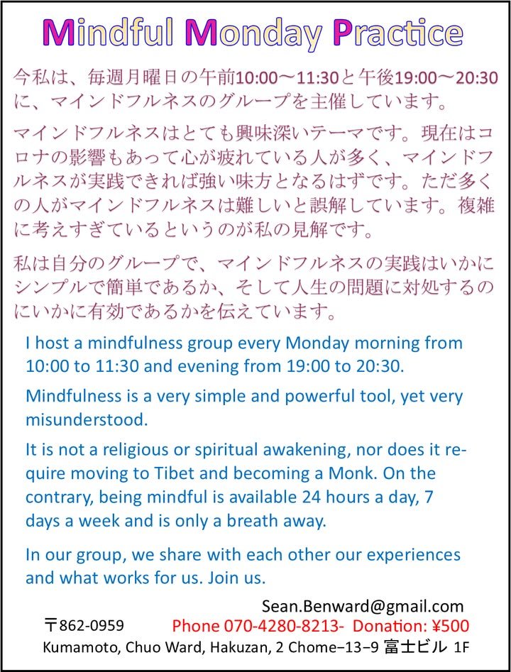 Kirk here with some information from Sean Benward. I have a mindfulness practice that I've enjoyed for a long time so anything related to mindfulness strikes me as a good idea. I haven't attended Sean's sessions but if I didn't have my own routine already, I think I would. (If you can't see it immediately, there's English text below the Japanese text.)