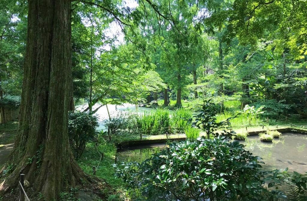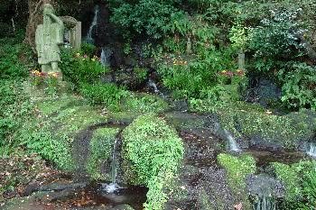 William A bit more about springs and where to find them: Kakibaru (柿原) is a neighborhood on the eastern flank of Mt. Kimpo, whose weight causes water to gush out in lots of places, one of which is called お手水の森 (ochyōzu no mori). The strange pronunciation is due to a legend: apparently, Takeiwatatsu no Mikoto (the main god of Ichinomiya Aso Shrine, who I wrote about the other day) used the spring for ablutions (sacred washing of hands); both that action and its location are referred to as お手水, ochyōzu (most shrines have お手水 for washing hands or rinsing out one’s mouth before prayers). The location, now run by a restaurant, has a small trough-like pond stocked with nijimasu (虹鱒 - rainbow trout) which can be taken home or they’ll cook ’em for you on the spot; a large pond not suitable for swimming; and, in the back corner, the spring, a waterfall which is the ochyōzu. The delicious, biting water tumbles down from fissures in a small cliff, and visitors are welcome to find a niche in which to chill. The official Website: https://nijimasu.jp/spot/ochozu/