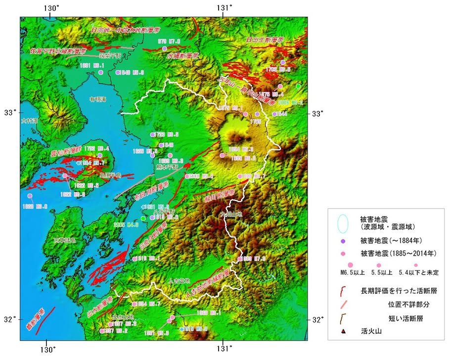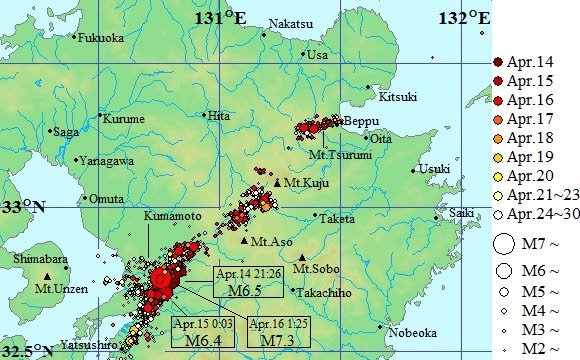 Regarding the 2016 quakes https://en.wikipedia.org/wiki/2016_Kumamoto_earthquakes, seismologists wrote (according to Wikipedia) that the foreshock was due to activity of the Hinagu fault zone, while the mainshock was the subsequent rupture of the Futagawa fault zone, showing how the two can work in tandem. I was unaware of this in 2016 and immediately posted after the first quake that further activity was unlikely. I was wrong, not being aware of the twin faults. The map below shows two foreshocks and the mainshock of M6.5 on April 14, M6.4 on 4/15, and M7.3 on 4/16.