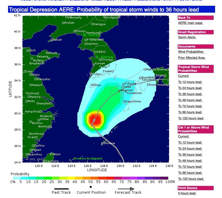 Kirk here with a follow-up to William’s and Atsuko’s posts about the approaching typhoon. Fortunately, it’s not very powerful. The image shows the current projection regarding how the storm will move in the next 24 hours. Though it looks like it will come close to being a direct hit on Kumamoto, it shouldn’t be a very hard hit, at least in terms of wind speed. Tropicalstormrisk.com says that the probability of tropical storm winds or stronger is less than 10%. But, on the other hand, we may have a lot of rain. Sometimes slow moving storms with relatively low wind speeds can do a lot of damage if they wind up dumping a lot or rain in one area.