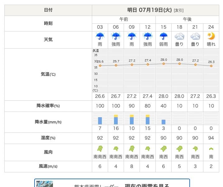 Kirk here with a little weather forecast. The image you see is for Kumamoto City tomorrow (Tuesday), but the forecast is pretty similar, I think, for the whole prefecture: Heavy rain in the morning.
