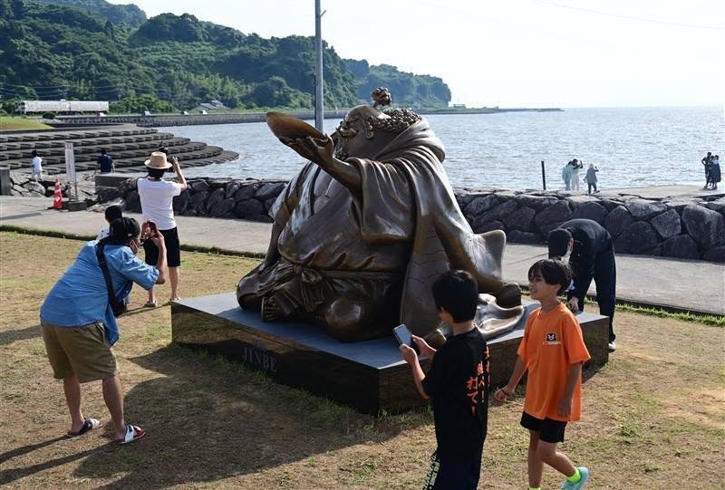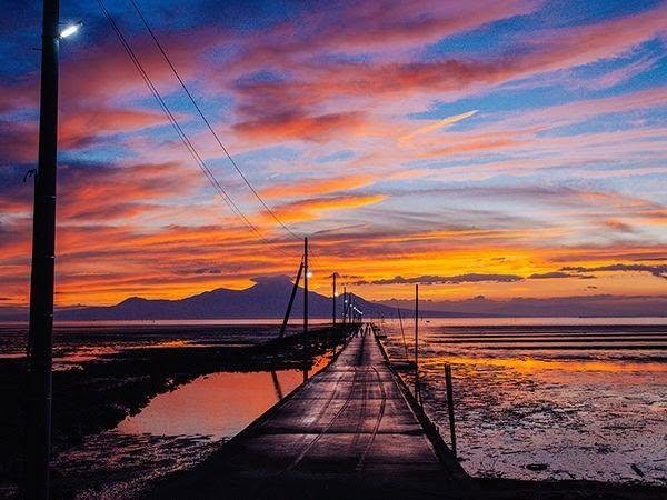 William The popular animation “One Piece” has nothing to do with Kumamoto save that its creator, Oda Eiichiro https://en.wikipedia.org/wiki/Eiichiro_Oda, was born here and has been giving back by donating sculptures of his characters to draw tourists. Recently, a sculpture of his character “Jinbei” was erected at Sumiyoshi Kaigan Park (住吉海岸公園) in Uto City. The park is adjacent to Ariake Sea, which has some of the most expansive mudflats in the world and is famous for the Nagabeta Seabed Road (Nagabetakaisyouro, 長部田海床路), also known as “The Road Leading to the Sea” (Umi e to tsudzuku michi, 海へと続く道). The 1km road, immensely popular with photographers, was completed in 1973 to allow fishermen to access the sea at low tide. The road disappears completely at high tide, and at night the lights of 24 utility poles illuminate the surface of the water like something out of Ghibli. The producer of a shochu commercial which helped popularize the road noted, “The road that appears and vanishes: it overlaps with the fragility of life.” Kumanichi has the details: https://kumanichi.com/articles/737593