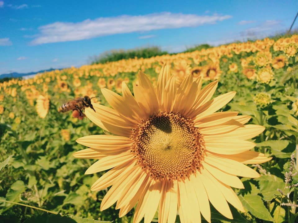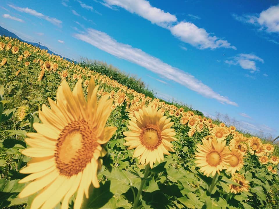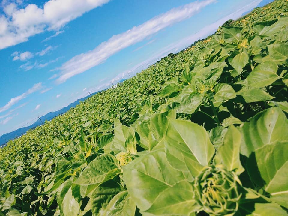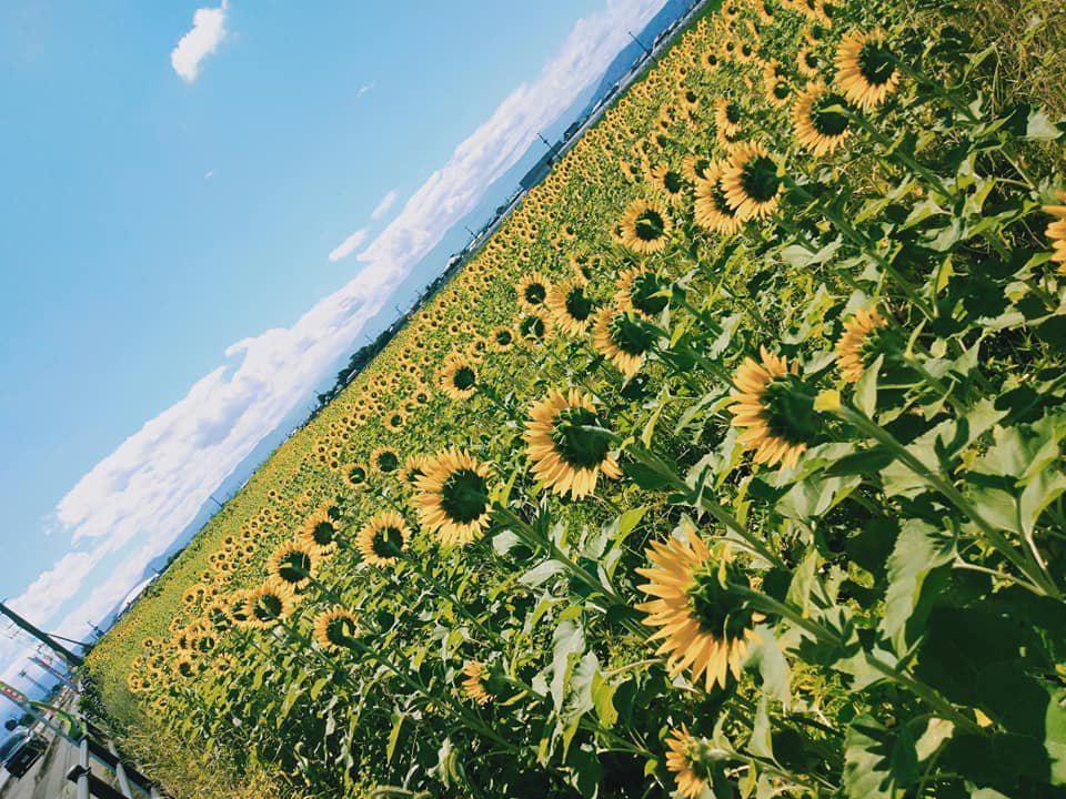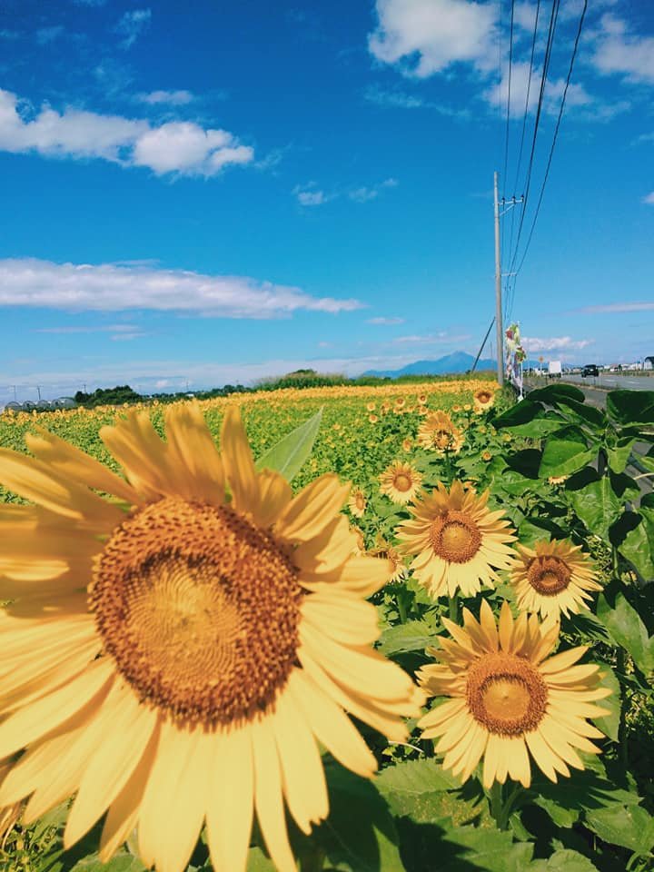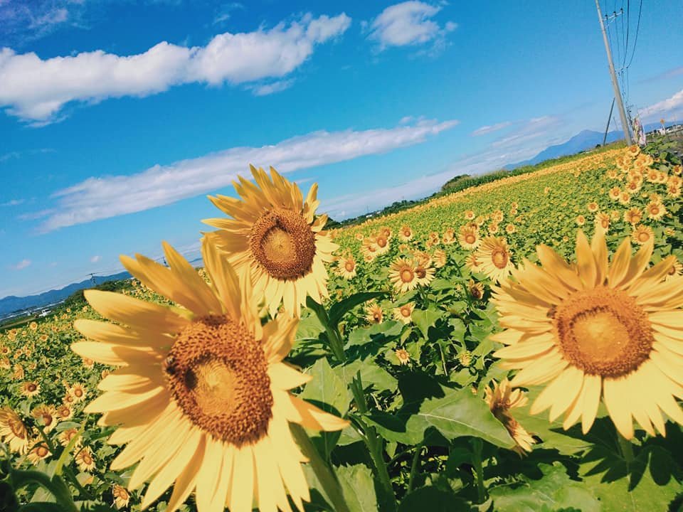 Atsuko here with lots sunflowers again. William had recommended a trip to Shimabara by ferry before, and if you take the ferry from Kumamoto Port, please enjoy this sunflower field as well. Take the East Bypass straight to Kumamoto Port, just past the Aqua Dome. There are two kinds of sunflowers planted, and the smaller one will be in full bloom soon (this weekend?). They are all facing east, and the mountain in the background is Unzen. Have a nice summer vacation!(๑˃ᴗ˂)و♡