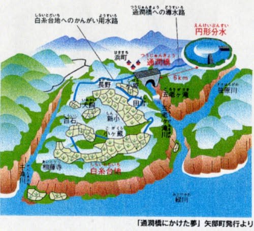 Several of these devices remain in Japan. Google 円形分水 for photos. One is in Yabe, to divert a stream’s flow into three, two divisions into the uplands and one through Tsujunkyo, which in turn irrigates the plateau to the south. No visit to Tsujunkyo is complete without a visit to this ingenious device. I’ve never jumped into it, but I suppose it would not be particularly dangerous.