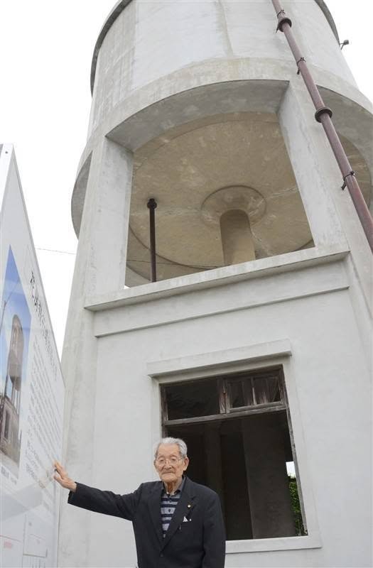 William The lovely town of Shisui is not the place one would stop at (even more go to) other than to visit the Michi no Eki Melon Dome. Work took me through the area countless times, yet I had no idea of its history as host to the Army Kikuchi Airfield. Next time I visit, I will view it through different eyes. Kumanichi reports on this: https://kumanichi.com/articles/759215 In 2008, the “Association to pass on the war legacy of Hanafusa (Kikuchi) Airfield to the future (花房(菊池)飛行場の戦争遺産を未来につたえる会)” was established. Their website is here: http://ans0924.blog.fc2.com/ Perhaps contacting them before visiting will result in a bilingual tour. Pictured below is Yasushi Kurasawa (101), a resident of Shisui, who says, “(This water tower) is a living witness to our history, standing up to the fires of war and sustaining our lives even after. I want to leave it to future generations as a symbol of peace and recovery.”