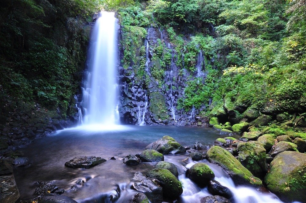William Shirakawa is quite diverse despite its short length, from its silent birth in the springs of Aso to its broad flow into Ariake Sea. A delightful area many overlook is its passage through Nishihara Mura, where a beautiful waterfall, Shiroito (“White Thread”), cascades 20 meters down volcanic rock hundreds of thousands of years old. Volcanic columns formed when lava cooled and solidified are apparent. The waterfall has been selected as one of the 100 best waters in Kumamoto Prefecture. Heavily forested, the spot is an oasis from summer heat, is not too far from the city, and embodies the three symbols of Kumamoto: red, from lava; green, from forest; and blue, from water. A pool at the fall’s foot allows for a dip, though be considerate of photographers. NOTE: Douglas Bruce comments below on the course of the river following the falls: it is the “Taki river which flows into the Kiyama river. The Kiyama river becomes the Futa river for a short stretch and then retakes the name of Kiyama river. The Kiyama river flows on into the Kaze river, which passes the southern end of Ezu lake. Finally the Kaze river joins the Midorikawa and then flows into the Ariake sea.” Thank you, Douglas.