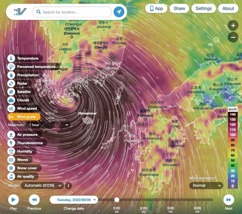 Kirk here with another typhoon update. The image is from Ventusky.com, which Douglas introduced to me. (Thanks!) I think it will be my go-to site from now on: https://www.ventusky.com/?p=34.01;129.42;6&l=gust&t=20220905/1800