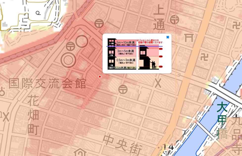 I read on it that the colors representing high water levels are for a “once in 1000 year flood.” So, for example, the Shimotori shopping arcade in downtown Kumamoto is projected to be covered in over 5 meters of water (!) in such a flood. Remarkably, other areas closer to the river would have lower levels than Shimotori. So, the projections in the map are not always intuitive; instead of relying on your gut feeling about your area, it’s probably a good idea to check the map to make sure.