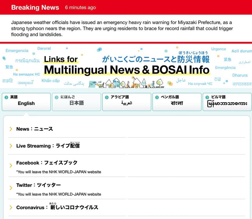 — start quote — NHK WORLD-JAPAN will keep you up to date with the latest information in 21 languages 「Links for Multilingual News & BOSAI Info 」 https://www3.nhk.or.jp/nhkworld/en/multilingual_links/?cid=wohk-doml-org_site_emergency_gs — end quote —