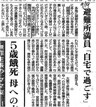 Kirk here with a little footnote regarding an issue that really bothered me as the recent typhoon approached: giving people (especially foreigners) the impression that EVERYONE was required to evacuate (go to a shelter) when, if fact, that wasn’t the official policy. I was mainly concerned about how such messages might waste people’s time (cause them to spend unproductive time in a shelter unnecessarily) or lead to a “boy crying wolf” effect (it’s just a** covering on the part of the officials – ignore them). This newspaper article (Asahi) from the Monday the 19th made me realize that another issue was involved. In Miyazaki City (which was under greater threat and sustained more damage than Kumamoto City) many shelters filled up completely. The article says that some people who would have preferred to be in a shelter had to remain at home. So, giving people who don’t need to evacuate the impression that they are required to do so may lead to centers filling up and preventing people who really need a place to shelter from doing so. This is just one more reason why NHK WORLD-Japan’s clear but factually incorrect “Lever 4 means every must evacuate” explanation needs to be corrected. Actually, I have an acquaintance at NHK WORLD-Japan and am planning to put my argument together in a tight package eventually and present it to him. I’m not sure but perhaps I can get them to make some adjustments in how they explain this stuff.