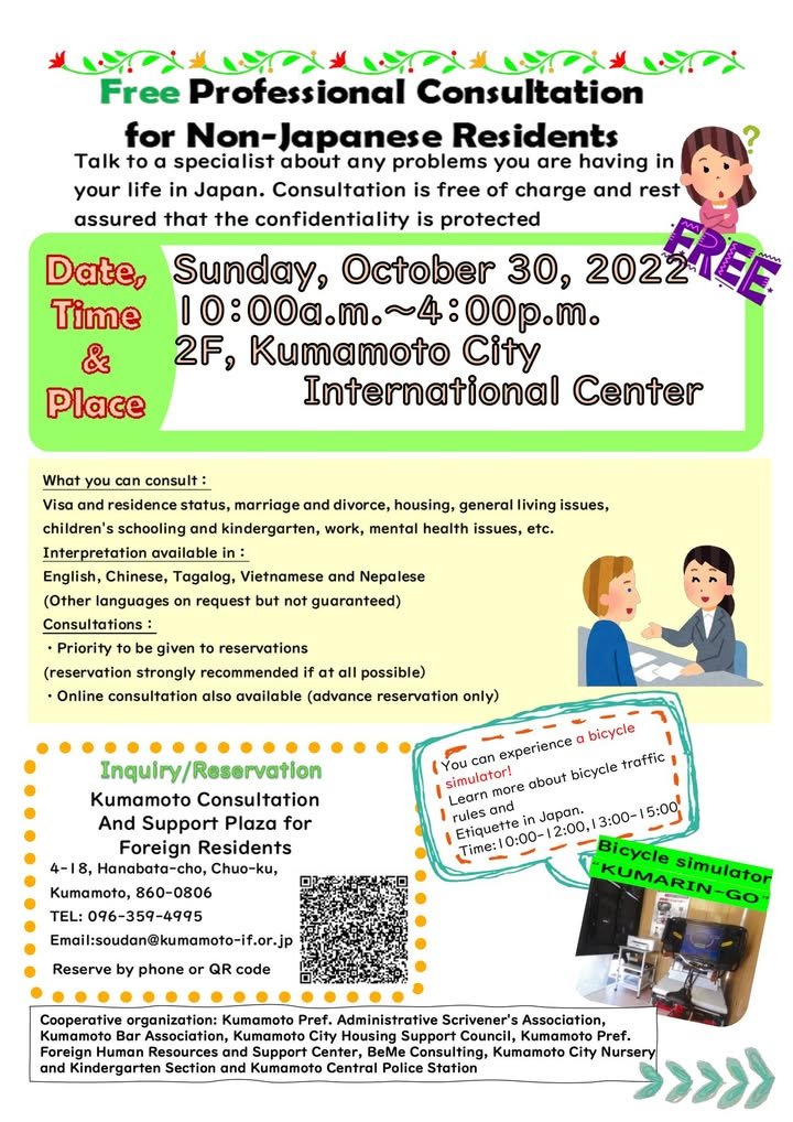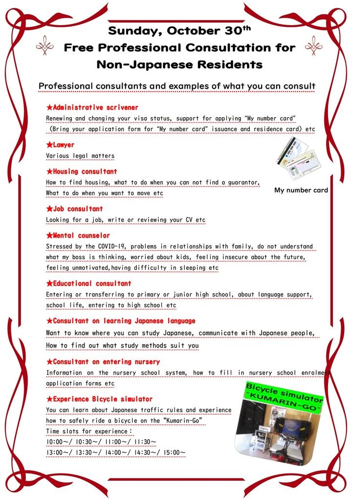 Kirk here with an event that is planned for October 30th (still a ways off): “Free Professional Consultation for Non-Japanese Residents”