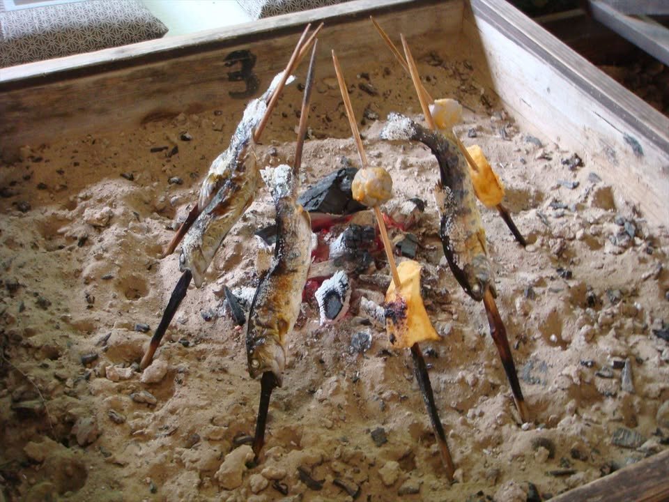 After crossing Midorikawa, one will immediately notice huge tubes descending the impossibly steep cliffs forming the narrow gorge you’re now in - those feed a Chiso Corp. hydroelectric power station. Just past the station is a small parking lot of the ayu (trout) restaurant, Heikenoyu (平家の湯, https://kimukazu.me/archives/3576), whose onsen is pathetic but ayunoshioyaki (鮎の塩焼き, salted trout grilled over charcoal) is the best in Kumamoto.