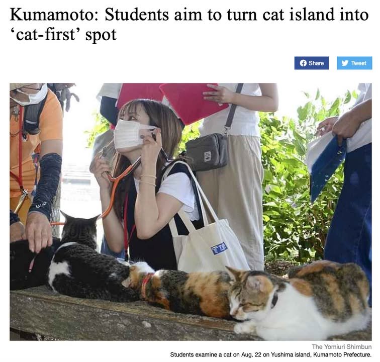 Kirk here sharing an article about an island in the Amakusa area called Yushima (湯島, “Island of Hot Water”), also known as Dangojima (談合島, “Island on which Locals Conspired in the Shimabara Rebellion of 1637). According to the article, it has one more name: “cat island.”