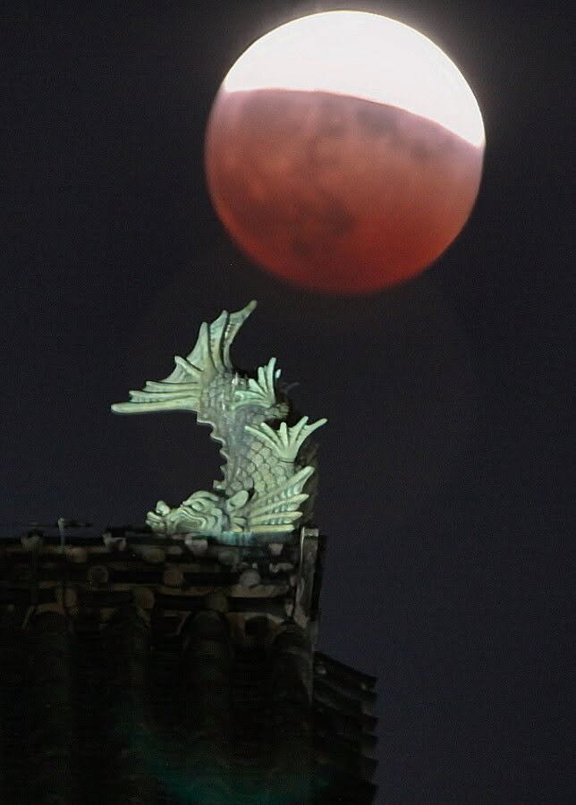William A reminder about Tuesday’s lunar eclipse, but first: The shachi (鯱 - a mythological animal with the head of a tiger and body of a fish, its tail fin always facing the sky and covered with layers of sharp thorns on its back) was commonly used atop castle gables as guardian gods to prevent fires: if not frightening away calamity, at least the shachi could (theoretically) spout water from its mouth to stop its spread. The two which now adorn the castle are replacements for the pair shattered during the quakes and measure 120 centimeters in height and 100 kilograms in weight. The full moon Tuesday evening seen from Ninomaru will rise behind the keep, appearing at about a 45° angle over the keep from 20:00, the greatest extent of its eclipse. Bring your camera and send us your photos! (Photo from a sadly long-extinguished blog, though Nishinippon Shinbun has a video on shachi replacement: https://www.nishinippon.co.jp/item/n/406704/.)
