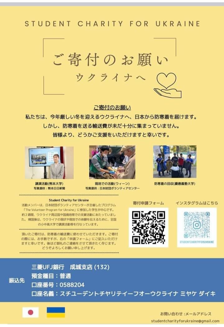 ウクライナ支援で現地(隣国ポーランドなど)へ行った大学生が協力して始めた支援活動です。現地のNPO「UAid Direct」と協議し、通してウクライナの人たちの届けます。 Japanese Universities’ students, who did volunteering there in the border area to Ukraine, thought how they could support Ukraine people suffering their severe cold winter, and have begun a project to collect as many clothes against the cold winter as they could, and send them to NPO UAid Direct that should be in charge of delivery of donated clothes there.